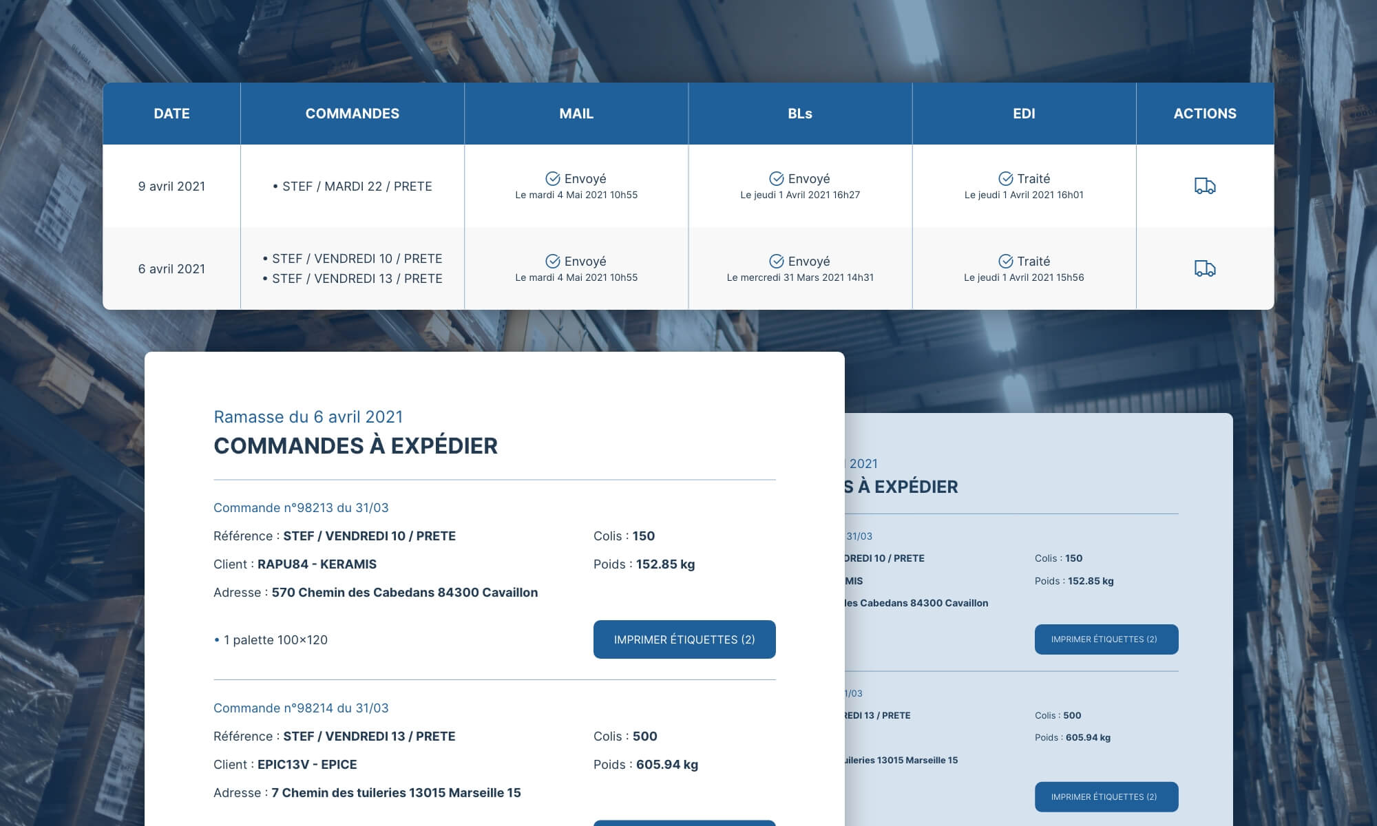 Notre solution logicielle sur mesure facilite la préparation rapide des ramasses et l'envoi automatisé des ordres de transport EDI aux transporteurs.